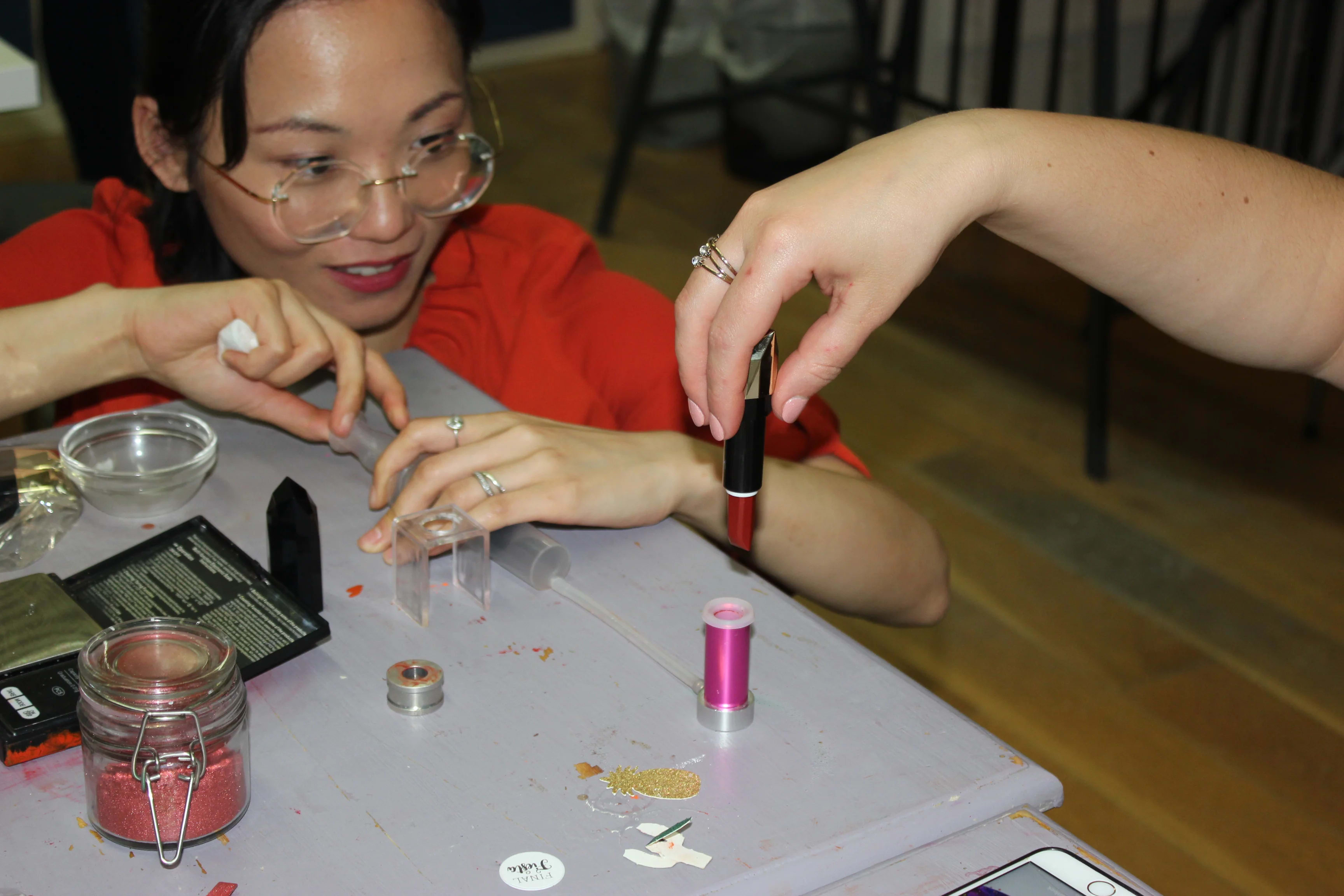 I had so much fun learning how to make my own natural organic lipstick. I didn't realise how precise you have to be when making lipstick and how you have to weight all the different ingredients carefully (some as little as 0.1 lbs!). We learned about the different essential oils that you can add to moisturise your lips or give a hint of a scent when on your mouth, and had to weight out the different organic shea butter, beeswax and almond oil to the perfect balance. The most stressful part (because who doesn't want the perfect shade to take home!) was blending the different pigments together to make the right hue of pink or red or purple or orange etc! The anticipation at the end while waiting for the lipstick to set was unbearable but finally when we pulled the moulds off and could see the finished product it was so worth the few minutes (was that all?!) wait and I am so thrilled with the lipstick that I can take home! I can wear MY new lipstick every day and know that I'm not putting anything toxic or unnatural on my face.