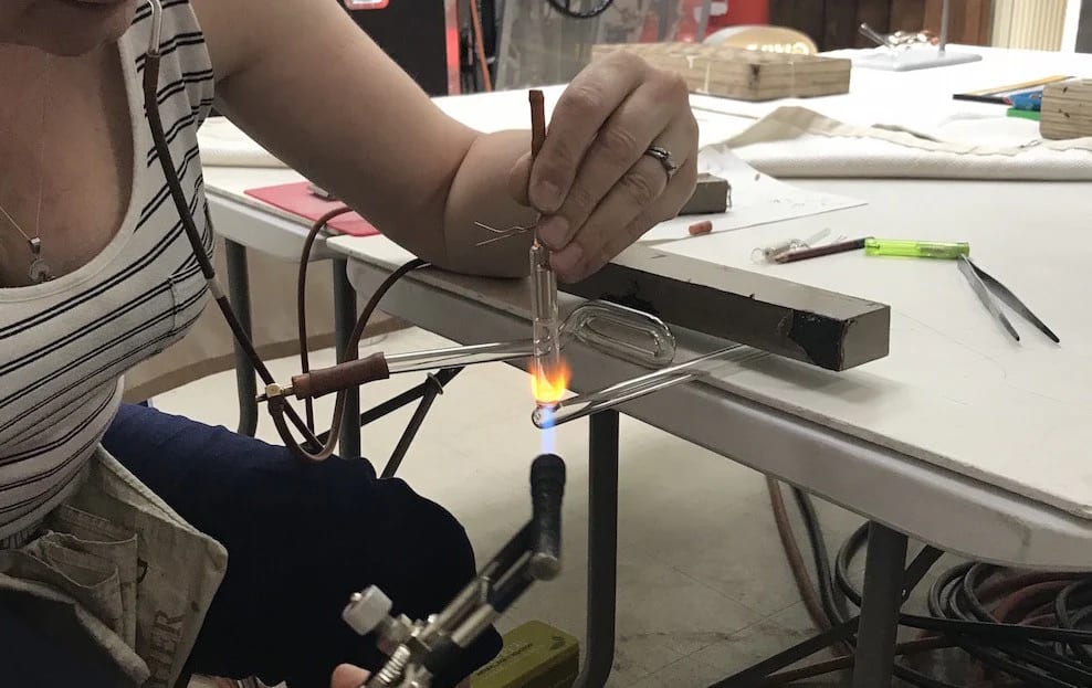 Richard and Julia took us step by step through each of the bending and contorting methods, then we were each able to take turns and try them out - heat protection, gloves, equipment and air-blowing valve in hand (and mouth)! We were then given free rein to experiment, hone our techniques using the flames and specialist machinery.